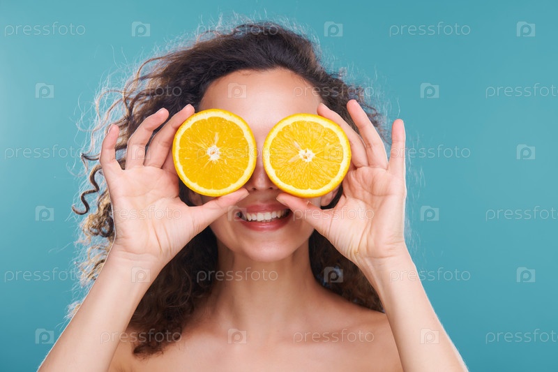 Молодая счастливая красивая женщина держит две половины сочного апельсина у глаз