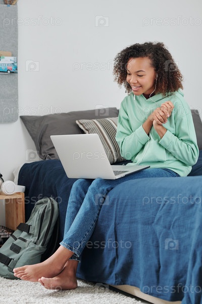 Современная веселая девочка смешанной расы общается через видеочат дома