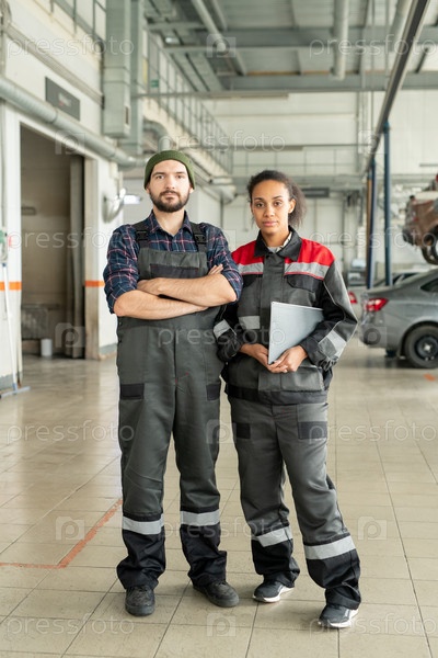 Два молодых современных работника автосервиса, стоящих в мастерской