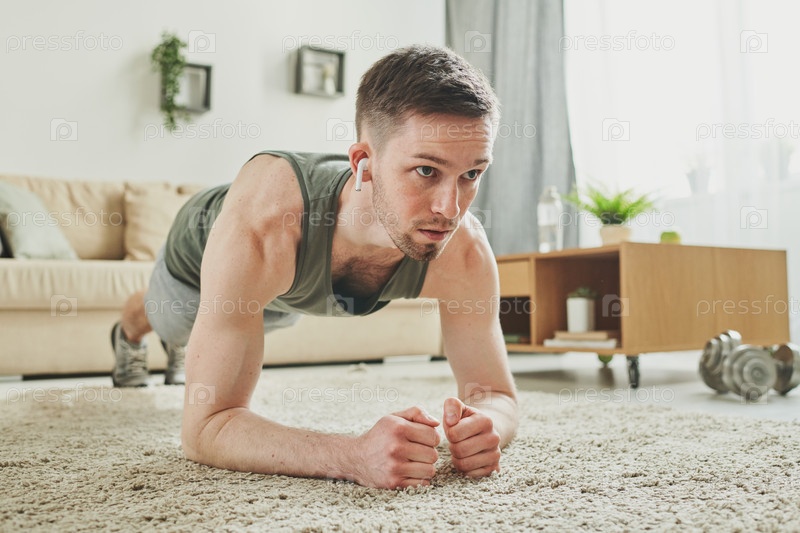 Активный мужчина с наушниками делает упражнения на доске на ковре в гостиной