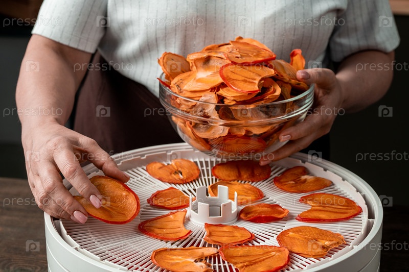 Руки зрелой самки в фартуке, берущей сушеные кусочки персимона или другого фрукта