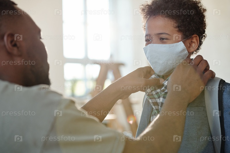Молодой отец выпрямляет воротник рубашки своего сына с защитной маской на лице