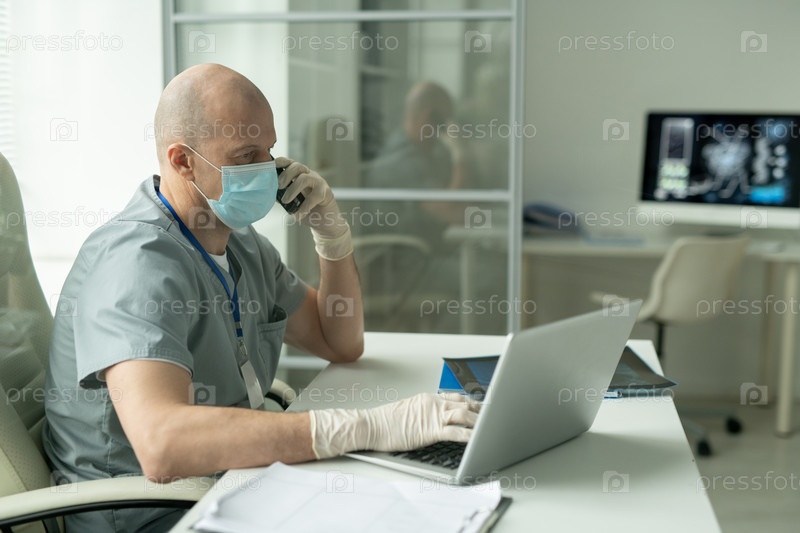 Боковой вид зрелого клинициста-мужчины в маске, сидящего за столом перед ноутбуком