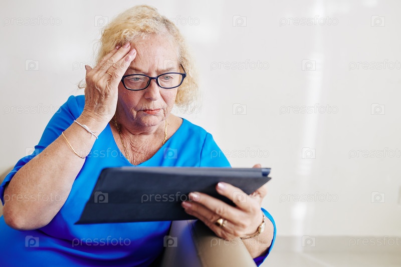Пожилая женщина читает тревожные новости