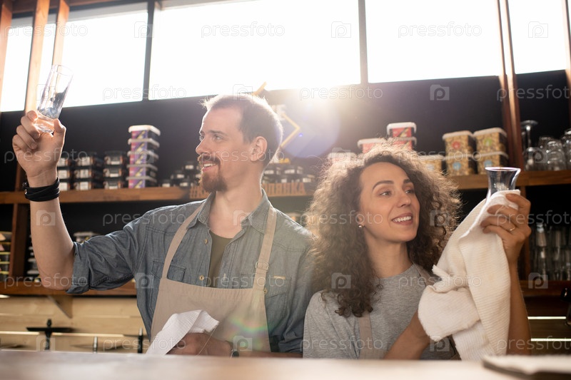 Счастливые молодые владельцы кафе или ресторана, чистящие очки с полотенцами
