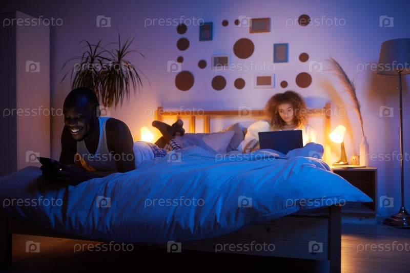 Пара, использующая компьютеры в постели по ночам