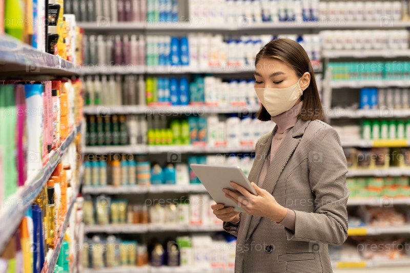 Зрелая женщина-клиент прокручивает список продуктов, которые можно купить в супермаркете