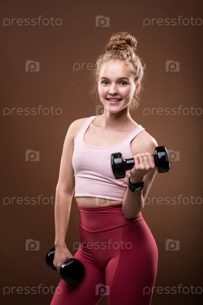 Молодая веселая спортсменка в активной одежде поднимает гантели во время тренировки