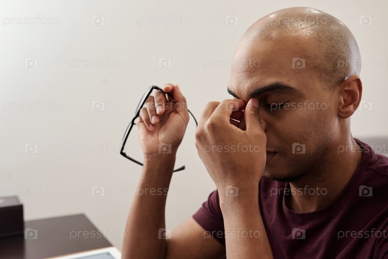Усталый мужчина снимает очки