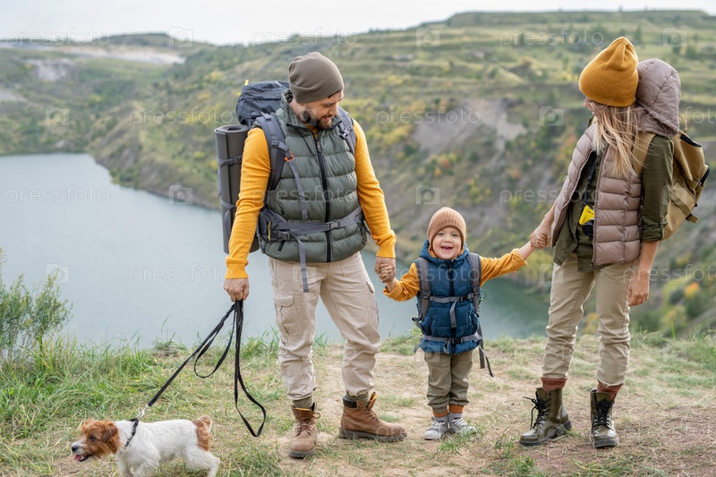 Счастливая молодая пара в теплых повседневных одеждах смотрит на своего милого маленького сына