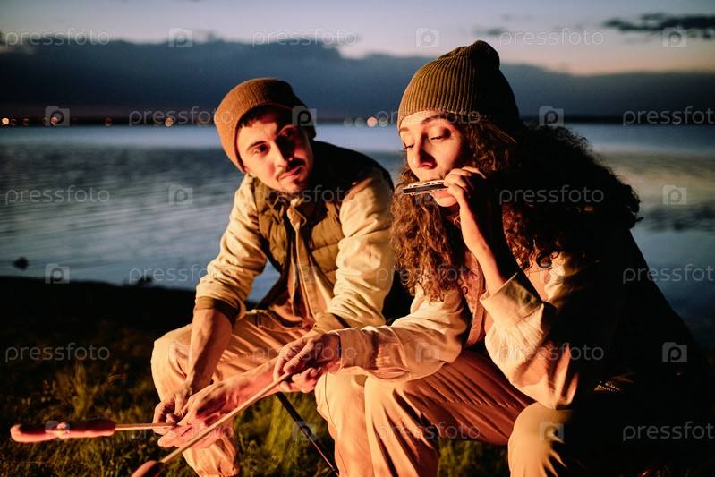Молодой мужчина-путешественник смотрит на свою жену, играющую на гармонике у костра
