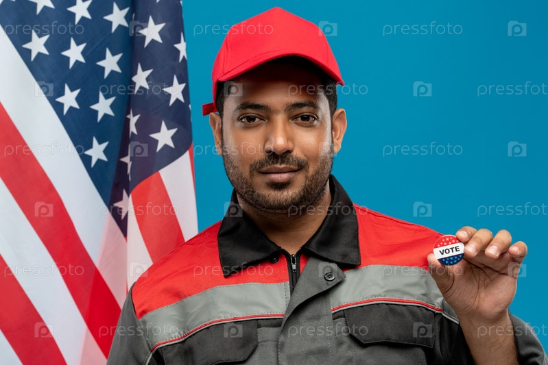 Молодой серьезный ремонтник испаноязычной этнической принадлежности, показывающий вам избирательные значки