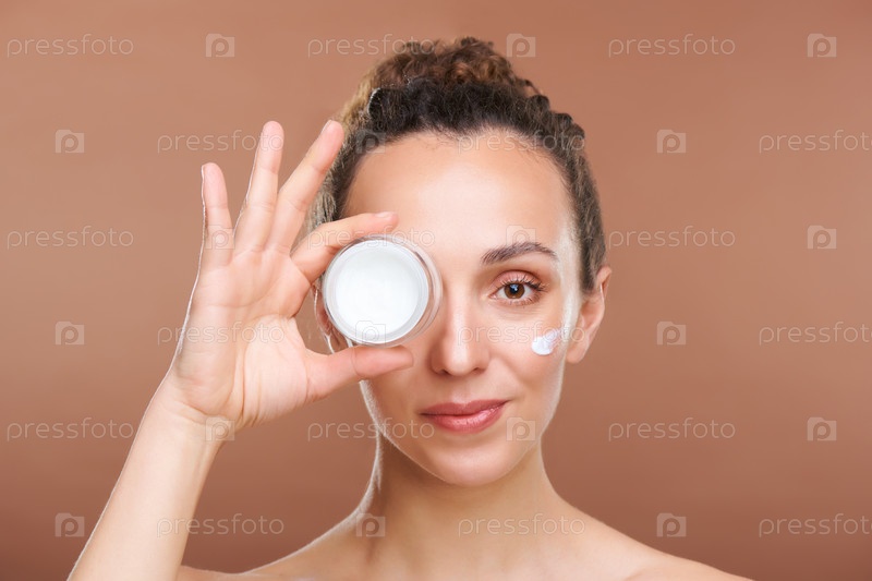 Здоровая красивая молодая женщина держит маленькую банку с подмоложивающим кремом у глаз