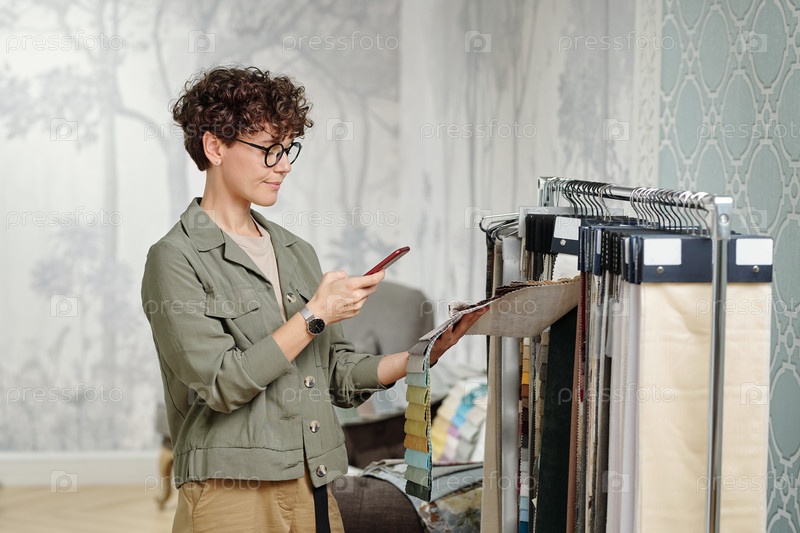 Молодая клиентка со смартфоном фотографирует новые образцы текстиля