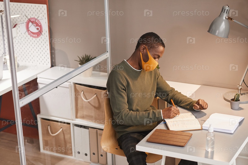 Молодой африканский мужчина, носящий маску за рабочим столом