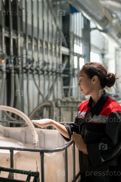Молодая работница фабрики или менеджер по контролю качества, держащая кучу гранул