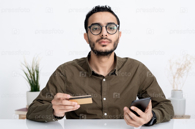 Молодой серьезный бизнесмен с кредитной картой и смартфоном смотрит на вас