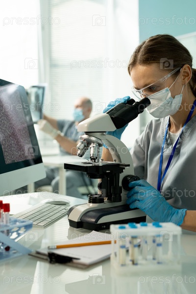 Клиник в униформе, защитной маске, перчатках и очках с помощью микроскопа