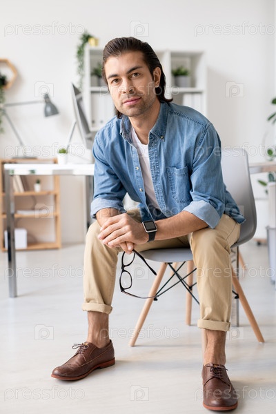 Молодой уверенный бизнесмен в повседневной одежде, сидящий на стуле перед камерой