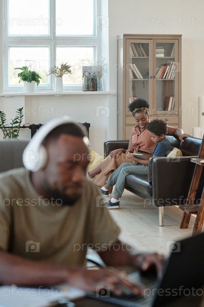 Молодая африканская жена менеджера домашнего офиса и их маленький сын отдыхают на диване