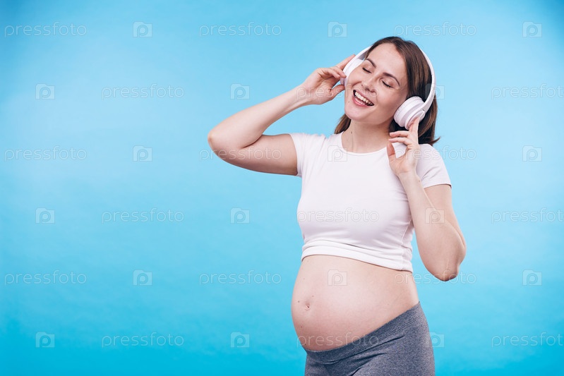 Молодая беременная женщина с наушниками поет одну из своих любимых песен