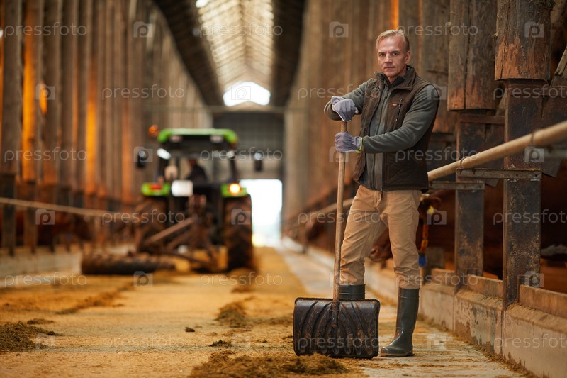Зрелый владелец фермы убирает сарай