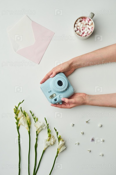 Женщина, держащая мгновенную камеру Flat Lay Woman