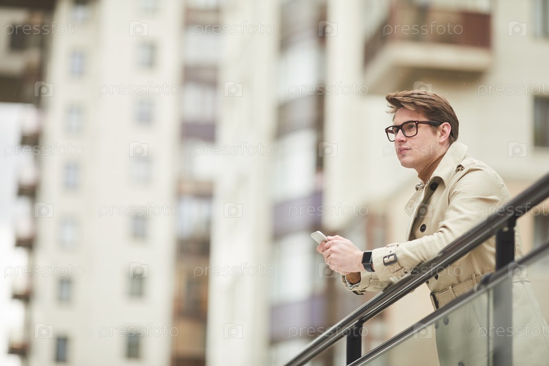 Задумчивый бизнесмен, стоящий на балконе на улице в городской обстановке