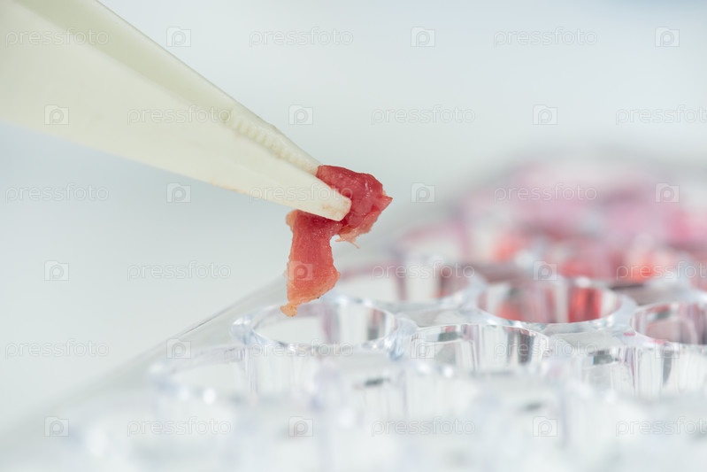 Белые пластиковые пинцеты с крошечным образцом сырого растительного мяса на маленькой клетке