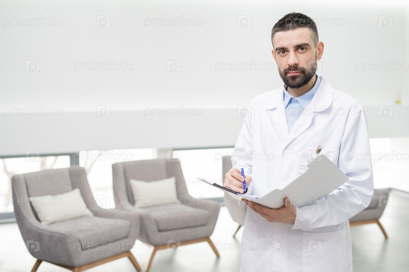 Средний взрослый стоматолог в белом халате делает заметки в документе в стоматологических клиниках