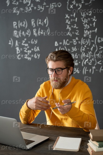 Уверенный учитель в очках смотрит на свою аудиторию на экране ноутбука