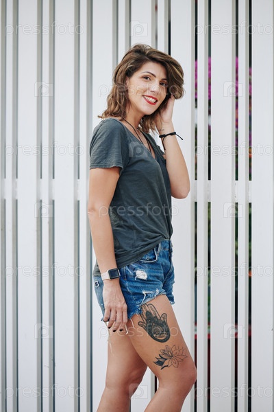 Улыбающаяся красивая женщина в джинсовых шортах