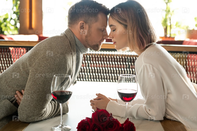 Молодые романтические свидания с лицами близко друг к другу сидят в ресторане