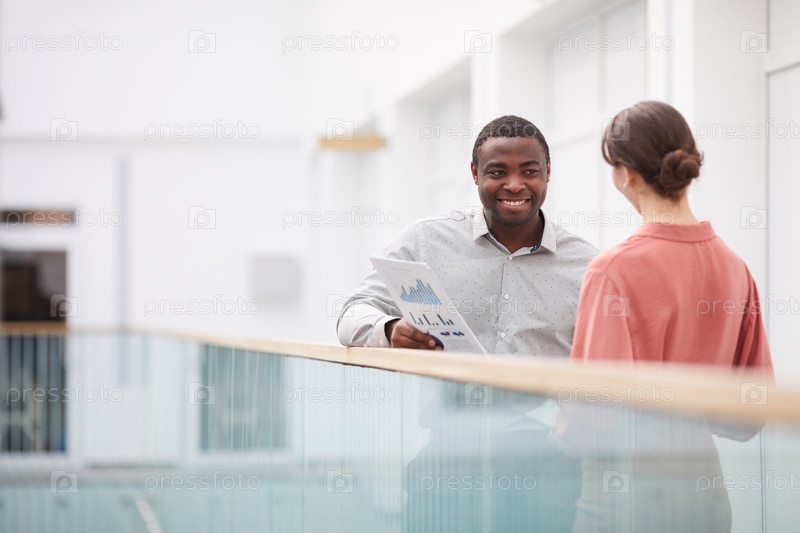 Улыбающийся африканский бизнесмен разговаривает с коллегой на балконе