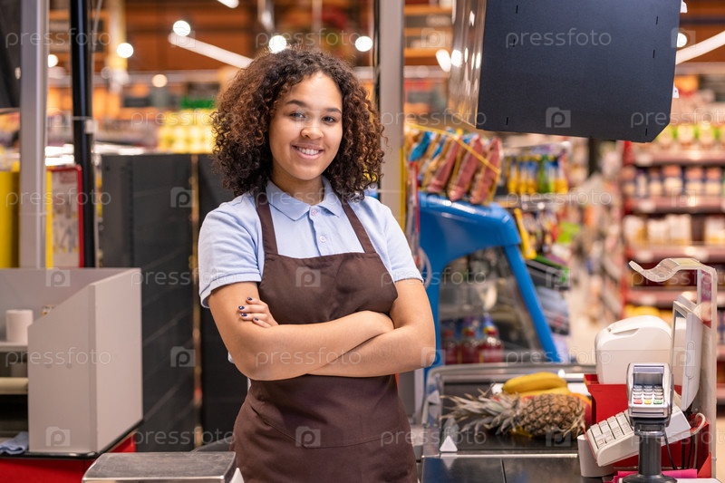 Девушка в фартуке стоит у кассы в супермаркете и скрещивает руки за грудь