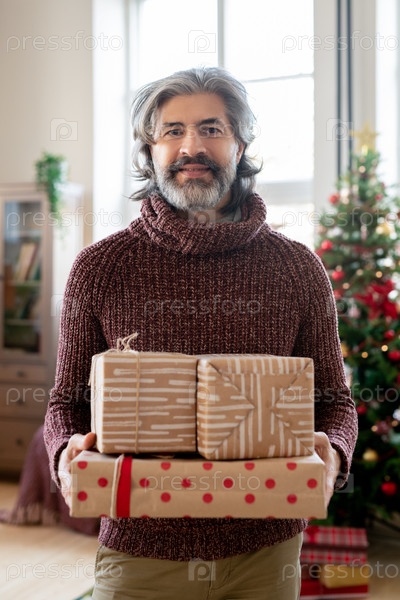 Счастливый зрелый мужчина держит упакованные подарки для своей жены и внуков