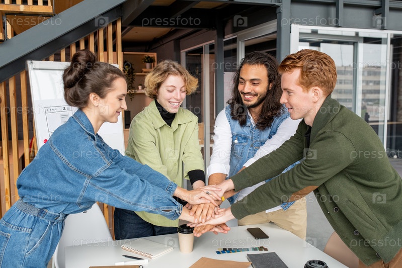 Счастливые молодые межкультурные дизайнеры или разработчики программного обеспечения, делающие кучу рук