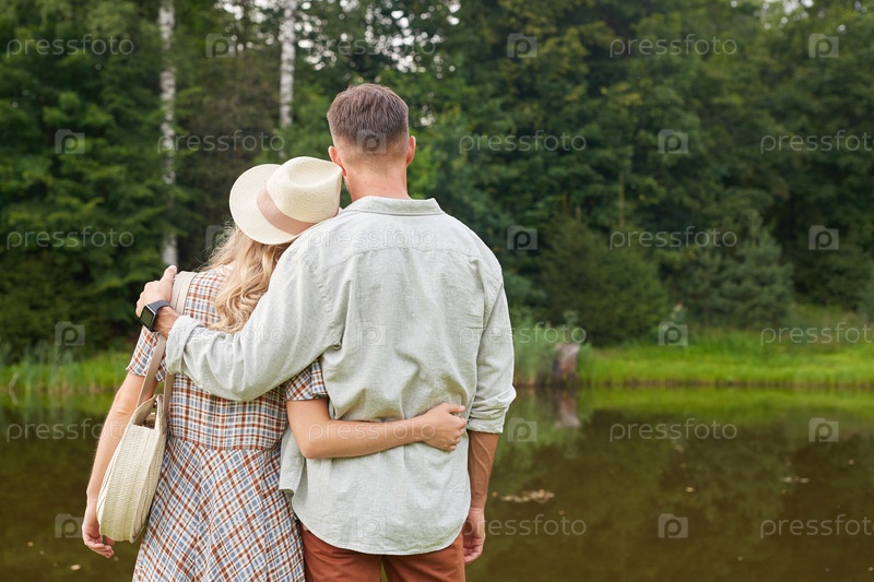 Романтическая пара обнимается у озера