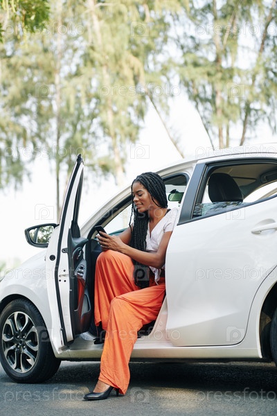 Женщина-водитель проверяет телефон