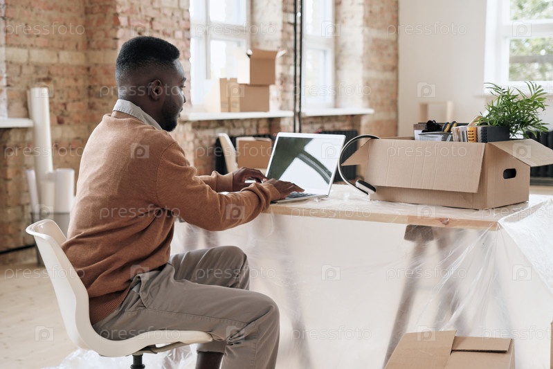 Загруженный молодой афроамериканский менеджер smm, сидящий за столом с распакованной коробкой для переезда и использующий ноутбук во время работы над стратегией продвижения в новом офисе