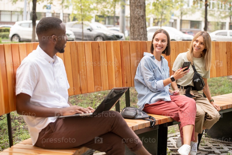 Молодой чернокожий мужчина с ноутбуком сидит на скамейке в парке и смотрит на счастливых девушек