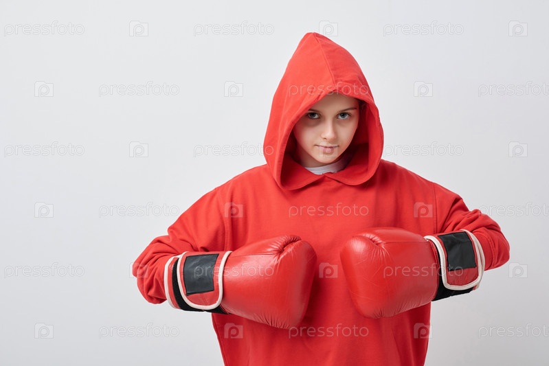 Серьезная девочка-подросток в красной капюшоне и боксерских перчатках держит руки за грудь