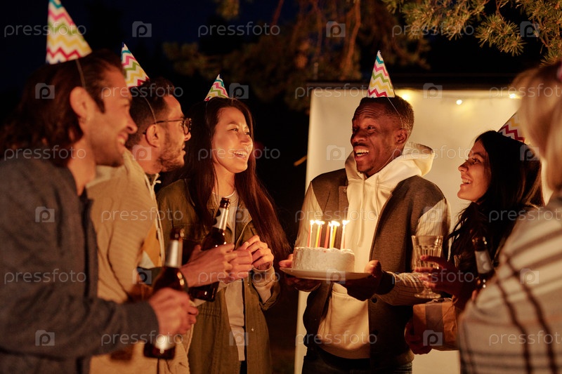 Молодой африканский мужчина с тортом смотрел на своих друзей, выпивающих напитки