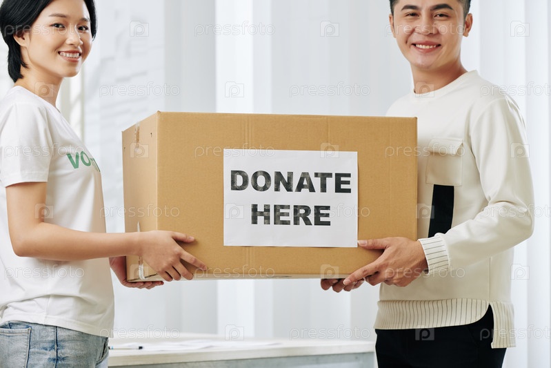 Волонтеры, несущие коробку с пожертвованиями