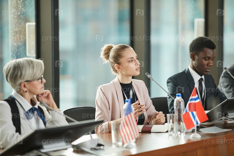 Молодая бизнес-леди, выступающая на конференции