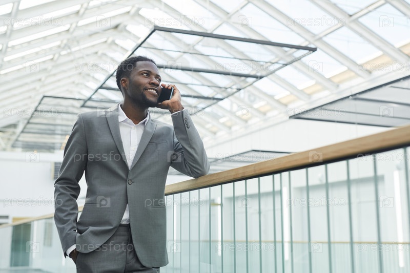 Африканский бизнесмен разговаривает по телефону в офисном здании