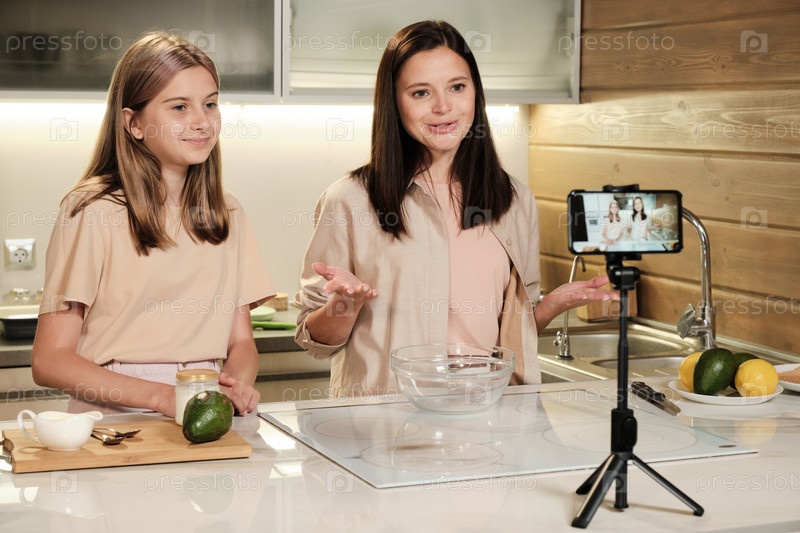Красивая брюнетка и ее дочь-подросток делают живое видео кулинарии