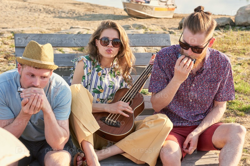 Друзья играют музыку на пляже