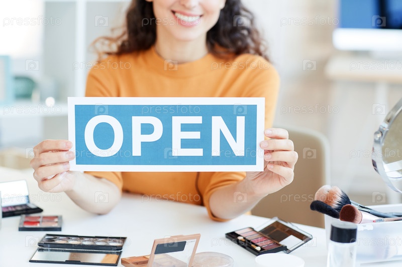 Блогер красоты, держащий открытый знак