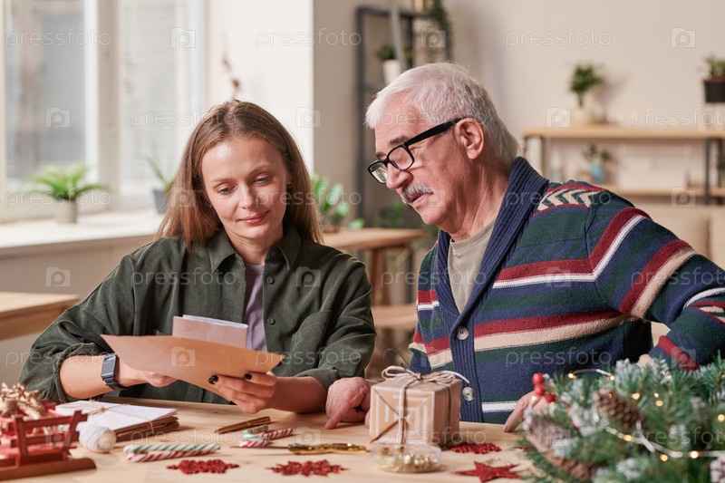 Улыбающаяся привлекательная молодая женщина в темно-зеленой рубашке сидит за столом с рождественскими украшениями и читает письмо со старшим отцом в очках